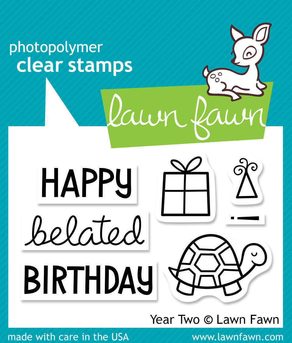 Better late than never! This collection of seven clear stamps was created to celebrate Lawn Fawn's second birthday.